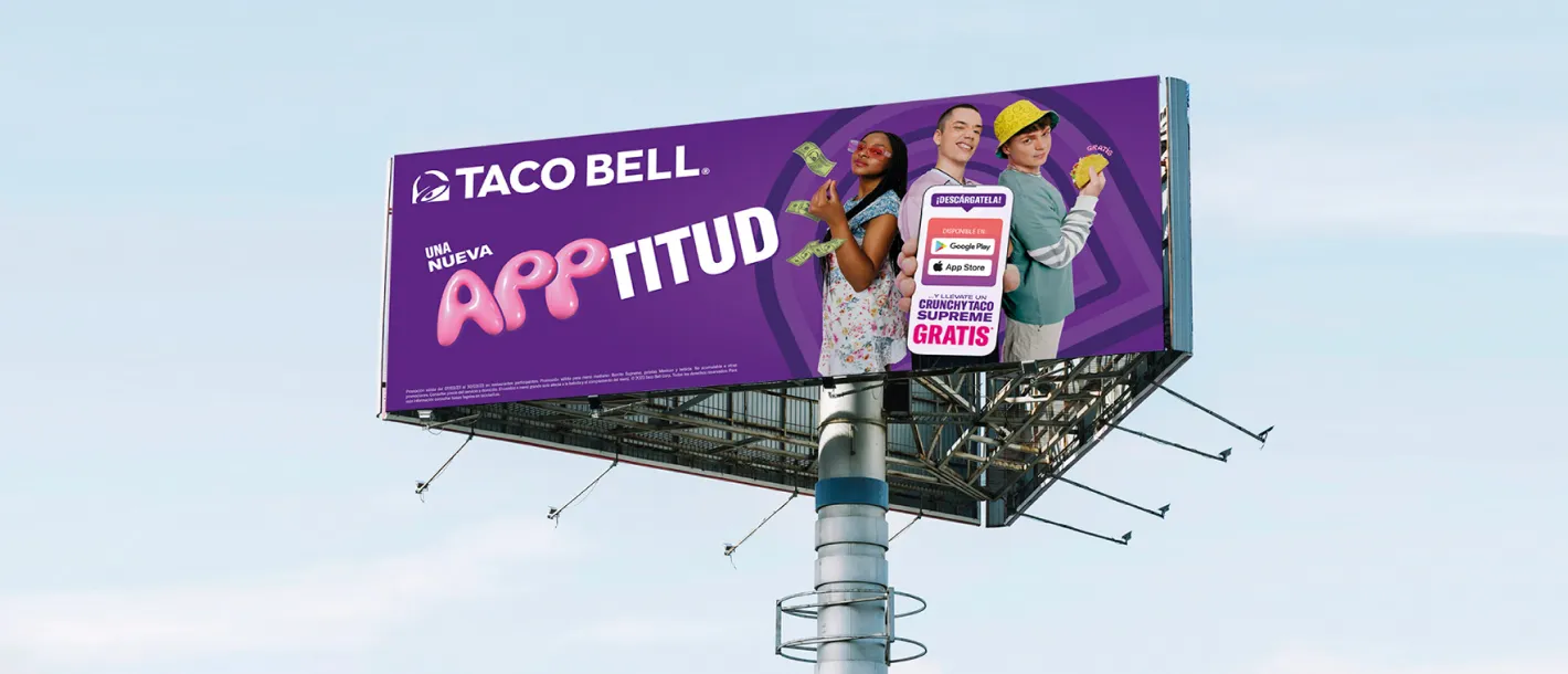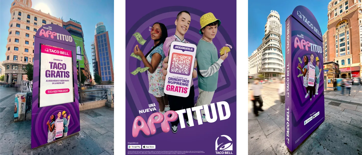 Para el lanzamiento de la nueva app de Taco Bell desarrollamos una campaña 360º dirigida a la Generación Z con el objetivo de generar descargas y registros desde el primer momento. Bajo el concepto creativo “Una nueva APPtitud”, un juego de palabras entre app y actitud, conectamos el lanzamiento con el espíritu rebelde y cultural de la marca. La campaña se desplegó en digital, social media y OOH, incluyendo mupis interactivos que invitaban a los usuarios a participar y descargar la aplicación mediante QR.